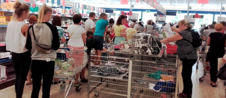 Nie było już cukru, owoców, żelków, wody niegazowanej, wędlin, serków i innych nabiałowych produktów na półkach z napisem „Promocja”, za to był tłum klientów. I gigantyczne kolejki przy kasach. Przy wszystkich kasjerzy pracowali na pełnych obrotach - starali się, jak mogli, aby jak najszybciej obsługiwać klientów. Tak wyglądał market Lidl dziś przed południem - ZOBACZ TUTAJ. Odwiedzali go nawet ci klienci, którzy wcześniej rzadko tam zaglądali.