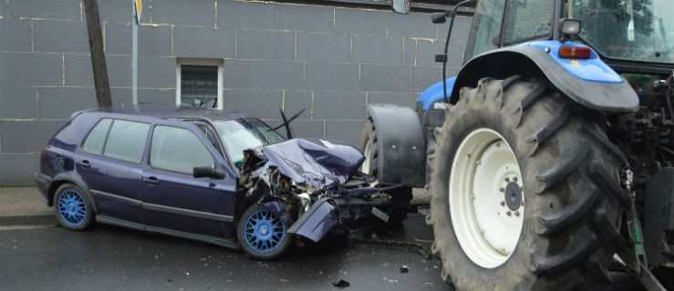 W Drzewcach (gm. Poniec) ciągnik rolniczy z przyczepą zderzył się z volkswagenem golfem.