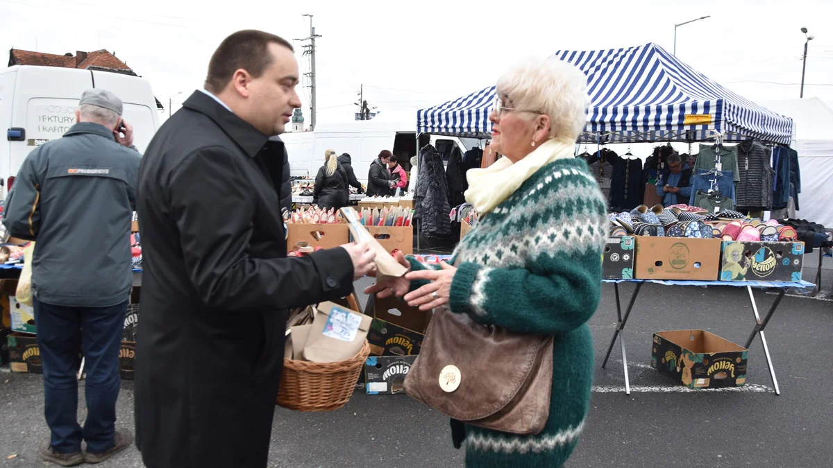 Burmistrz Gostynia rozdawał na targowisku cebulki kwiatów