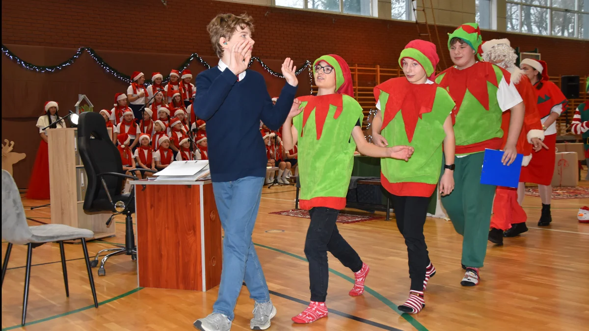 Później pokazano spektakl, przygotowany przez uczniów, na podstawie scenariusza stworzonego wspólnie przez dyrektorkę i polonistkę - Beatę Kopaszewską oraz Magdalenę Woźniakowską. Zgodnie z nim elfy oraz Święty Mikołaj współpracują z dyrekcją, by zakończyć w terminie remont szkoły, przebiegający z pewnymi trudnościami.