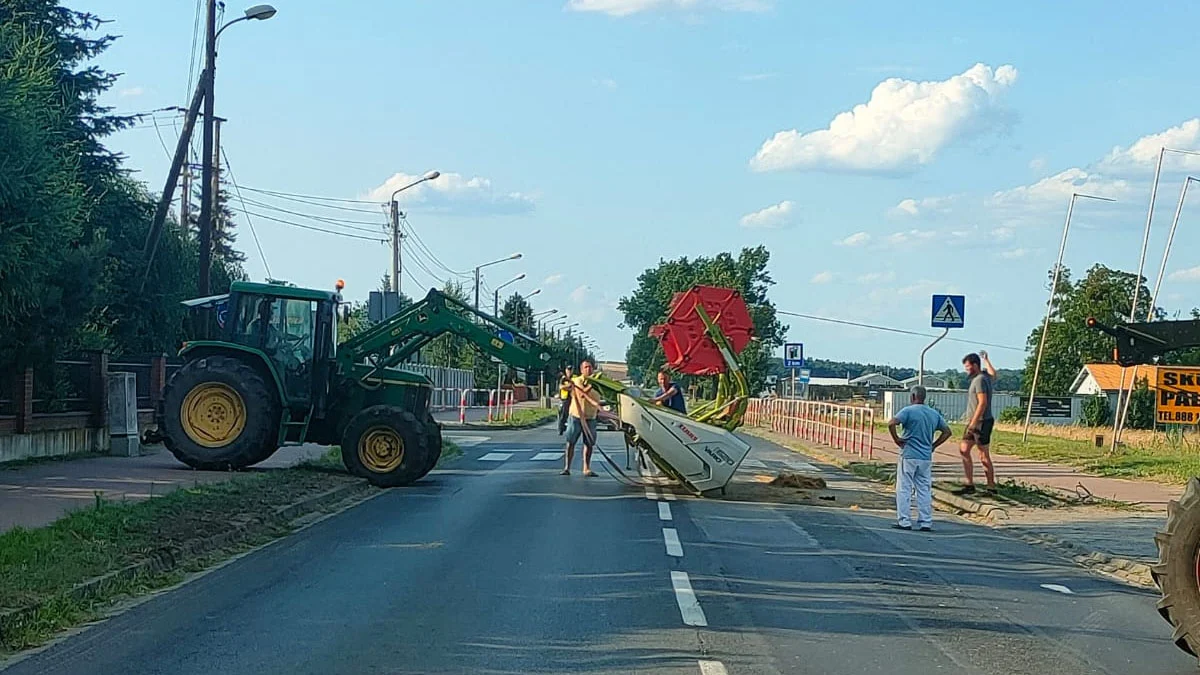 Utrudnienia w ruchu, spowodowanie głównie usuwaniem z jezdni oderwanych elementów kombajnu, trwały około godziny. Aby przewieźć heder, wezwano pomoc - do transportu miała posłużyć przyczepa do przewożenia balotów. Kierowca ciągnika - ładowarki, do którego była podpięta, miał pecha.
