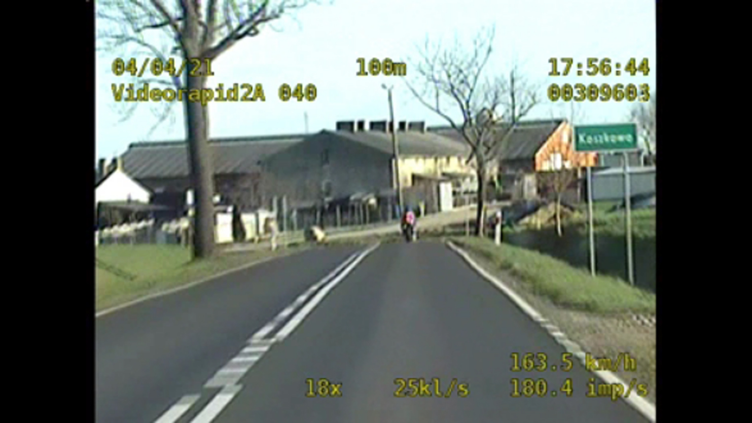 30-letni mężczyzna, mieszkaniec powiatu gostyńskiego, pędzący na motocyklu, z dróg w gminach Dolsk i Borek Wielkopolski zrobił sobie tor wyścigowy. Jechał ponad 200 km/h, a w terenie zabudowanym, na przejściu dla pieszych z prędkością 112 km/h, wyprzedzał też nieraz na podwójnej ciągłej.