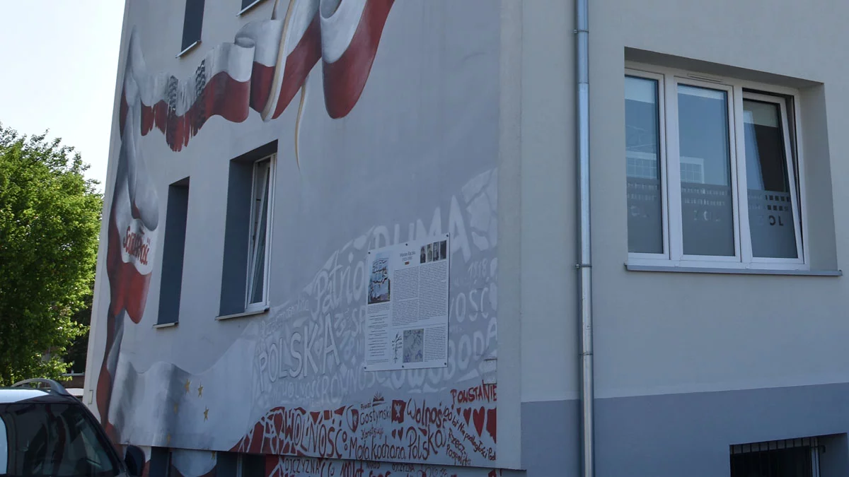 Nowe elementy na niepodległościowym muralu w Gostyniu. Najpierw grafika, potem tablica