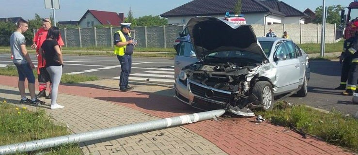 VW skasował lampę uliczną, wiec wezwano pogotowie energetyczne. Na miejscu pracują policjanci i strażacy.