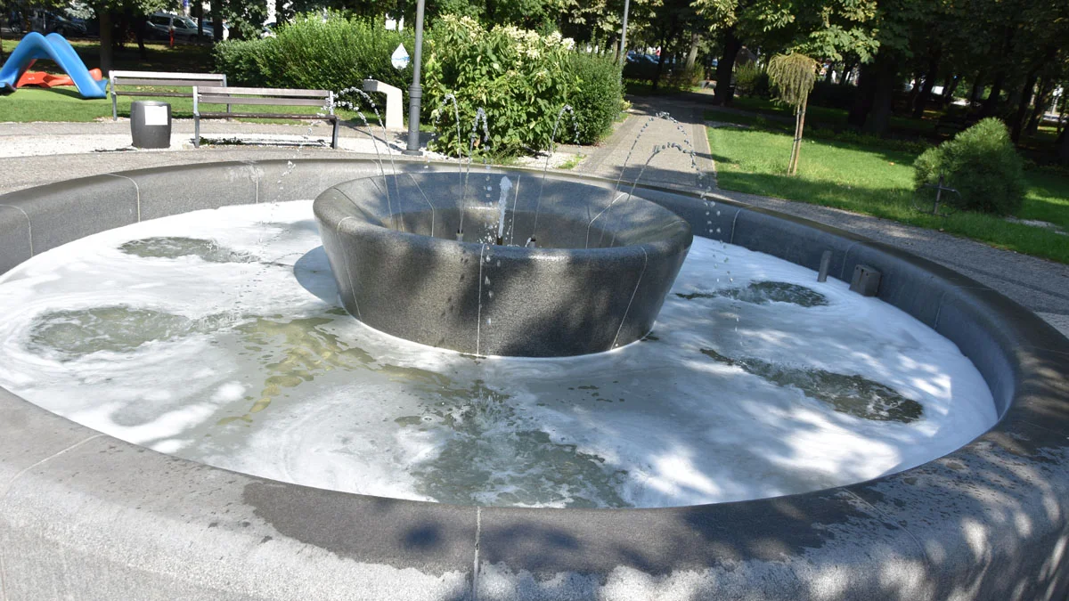 Spacerowiczów, którzy we wtorek 22 sierpnia 2023 r. o poranku, a także przed południem odwiedzili gostyńskie planty i usiedli na ławce, znajdująca się w pobliżu fontanna powitała wodą pokrytą pianą. Im bardziej woda się burzyła, tym więcej było piany i zapachu chemicznej substancji, przypominającej... płyn do mycia naczyń, ewentualnie do kąpieli.