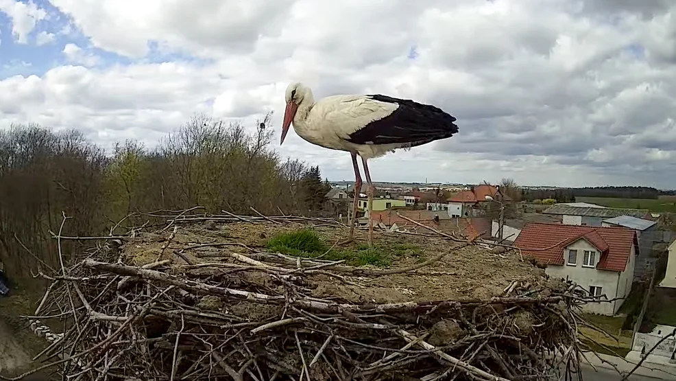 Gostyń. Do Krajewic doleciał długo wyczekiwany lokator bocianiego gniazda | stop klatka z nagrania kamery