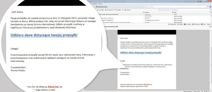 „Do Klientów Poczty Polskiej i innych dużych firm, docierają fałszywe wiadomości mailowe (...). W tych wiadomościach znajdują się często linki do stron internetowych czy fałszywe informacje o nieodebranej przesyłce” - czytamy w komunikacie prasowy zamieszczonym na stronie internetowej Poczty Polskiej.