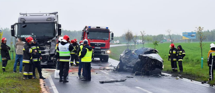 Czołowo zderzyły się osobowa mazda i cysterna przewożąca mleko.