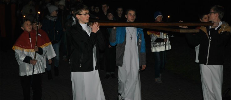 Na rozważania Męki Pańskiej parafianie przybyli wieczorem, na godzinę 20.00. Tegorocznej Drodze Krzyżowej przewodniczył ksiądz wikariusz Damian Skoniecki, a wspierał go ks. kanonik Dariusz Bandosz. Krzyż nieśli ministranci.