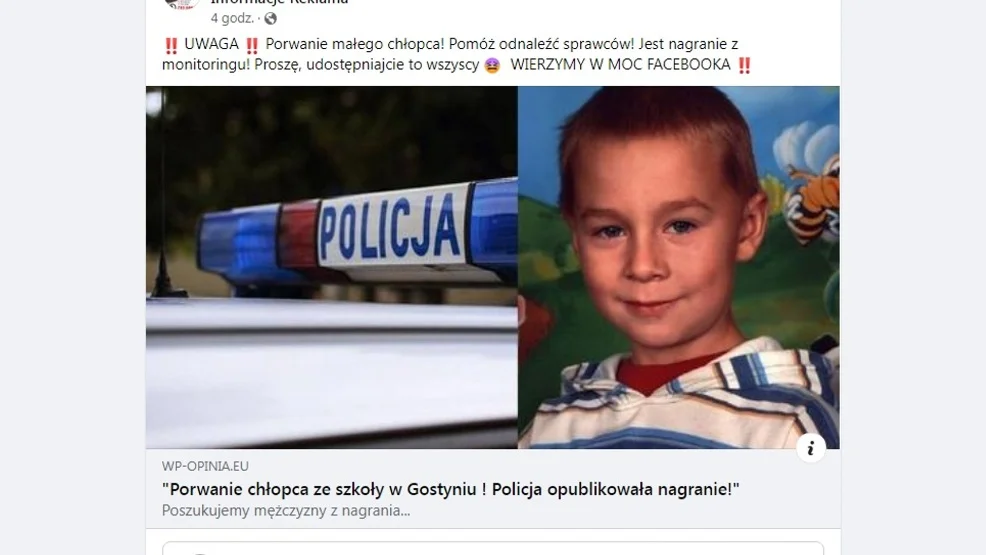 "Porwanie chłopca ze szkoły w Gostyniu ! Policja opublikowała nagranie!" - głosi tytuł "artykułu" zamieszczonego na "portalu" wp.opinia-eu.