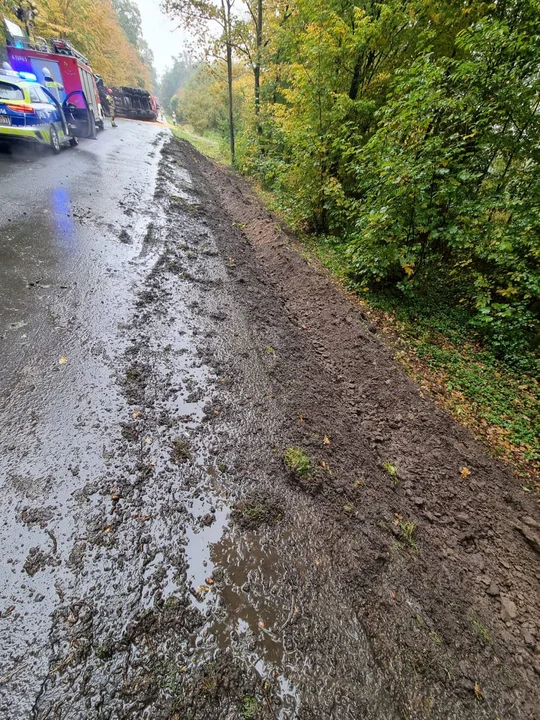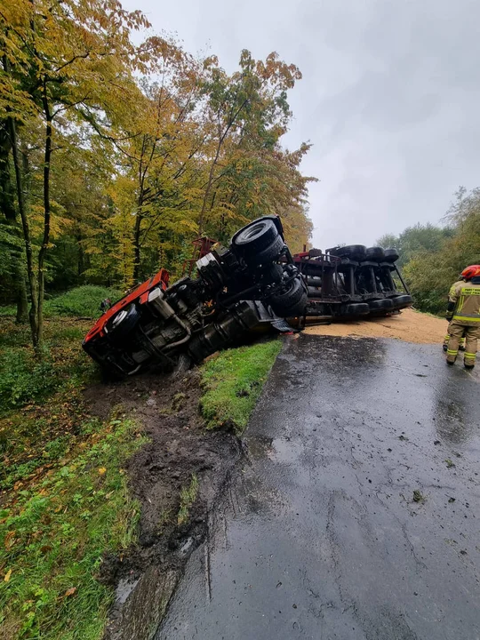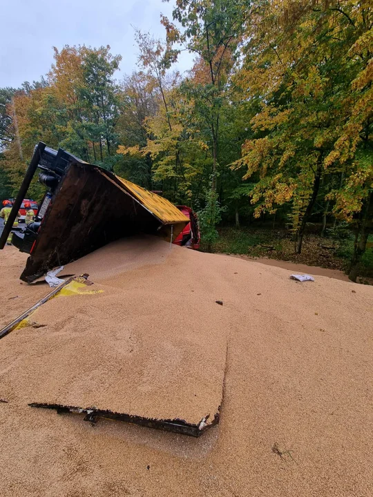 Przewrócony TIR i tony zboża na drodze z Pępowa do Gostynia