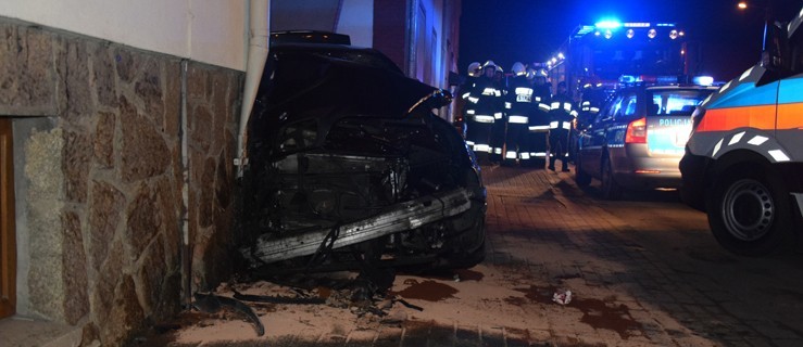 Około godz. 20.10, przy ul. Powstańców Wlkp. samochód osobowy BMW, poruszający się od strony rynku, wjechał w mur budynku jednorodzinnego. Dzięki temu, że siła uderzenia uruchomiła poduszki powietrzne, kierujący autem mężczyzna odniósł niewielkie obrażenia (głównie ma poranione ręce). Przód auta jest zmasakrowany, na chodniku porozrzucane są części samochodu oraz szkło.