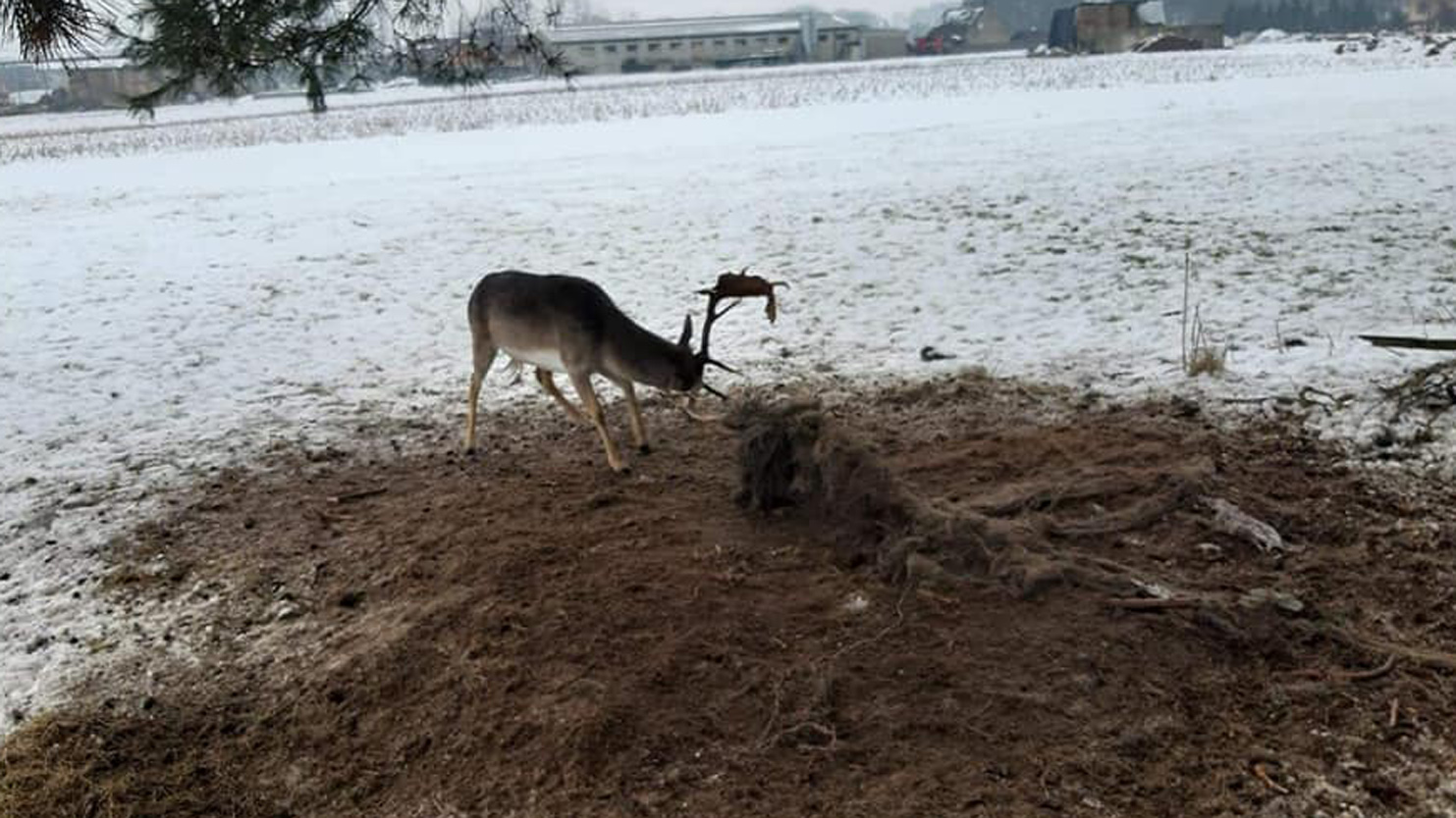 - Gdy przyjechaliśmy na miejsce zauważyliśmy byka daniela, który zaplątał się w sznurki, które znajdowały się częściowo zakopane w ziemi – relacjonuje jeden z myśliwych.