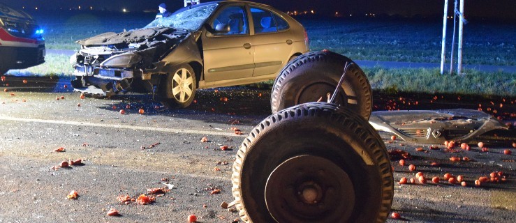 Renówka uderzyła w przyczepę z pomidorami. Kierowcę zabrało pogotowie - Zdjęcie główne