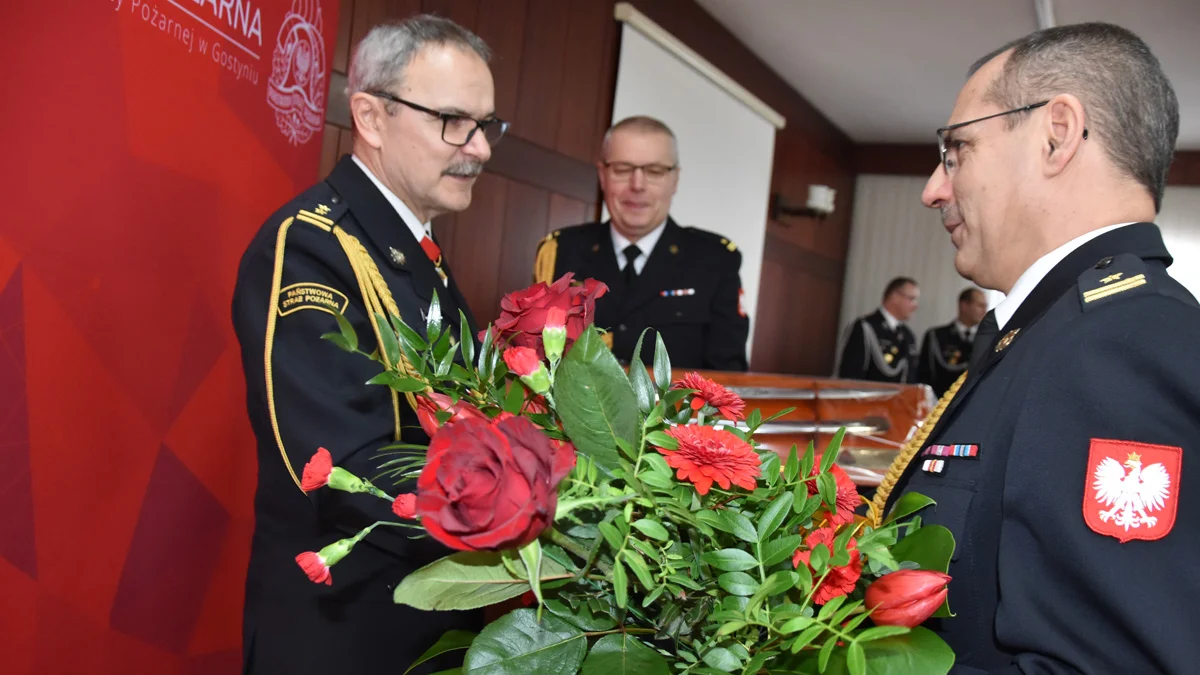 Komendant powiatowy gostyńskiej straży pożarnej, st. kpt. Marcin Nyczka, podziękował swojemu zastępcy za kilkanaście lat wspólnej pracy.