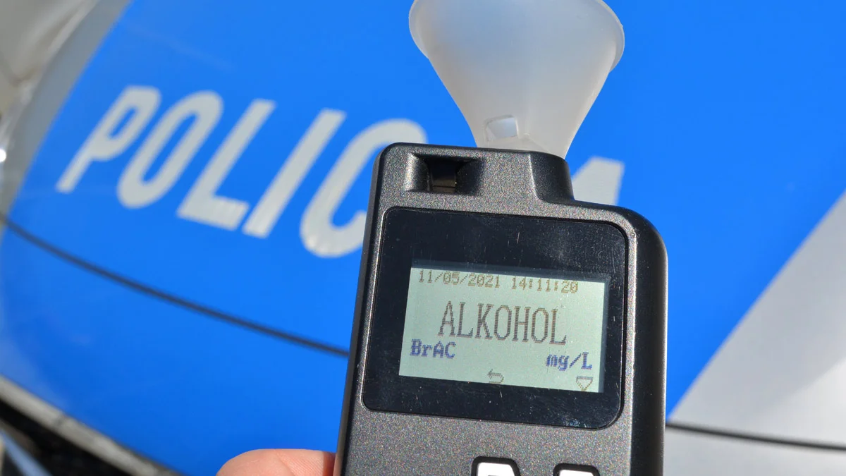 Badanie urządzeniem kontrolno-pomiarowym wykazało 2.1 promila alkoholu w wydychanym powietrzu.