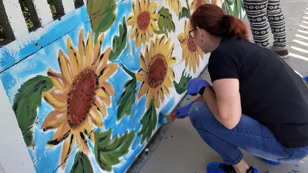 I ma racę. Anna Sowula, kierownik BOIK wraz z obywatelkami Ukrainy, a także z ich dziećmi wykonali piękne szkice słoneczników, a później wspólnie z mieszkańcami Chumiętek malowali mural, który pozostanie w ogrodzie domu pomocy na kolejne lata również jako świadectwo tego, co się działo w Ukrainie i w naszym kraju w tym roku. Również mieszkańcy DPS Chumiętki chętnie brali udział we wszystkich działaniach, nie tylko w malowaniu murala, ale również wcześniej, zaraz po wybuchu wojny przyłączyli się do szerokiego grona osób chcących pomóc Ukraińcom w tych trudnych chwilach. Na zajęciach przygotowali flagi ukraińskie ze słowami wsparcia, a także - mimo swoich niewielkich dochodów - przyłączyli się do zbiórki środków dla uchodźców z tego kraju.