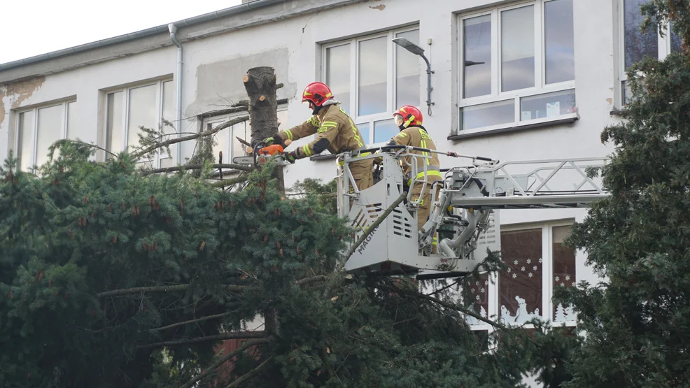 Chociaż wichury teoretycznie już przeszły nad naszym terenem, ciągle przybywają kolejne zgłoszenia o połamanych drzewach. Przy gostyńskim Przedszkolu Miejskim nr 7 kilkunastometrowy świerk wprawdzie był cały, ale odsłonięty system korzeniowy groził przewróceniem się - albo na budynek placówki, albo na pobliskie osiedle.