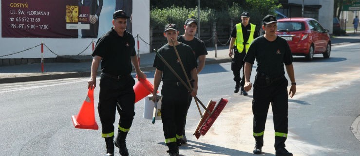 - Dziś w godzinach porannych KP PSP w Gostyniu otrzymała zgłoszenie o rozlanej substancji na łuku ulic Powstańców Wielkopolskich i Sądowej. Na miejsce został wysłany zastęp straży pożarnej, który zabezpieczył rozlaną plamę i przy użyciu sorbentu do wycieków przystąpiliśmy do jej usunięcia z jezdni. Wyciek ciągnął się na długości około 100 metrów. Był on dość wąski, co pozwala przypuszczać, iż pochodzi z jakiegoś pojazdu, którego nie było na miejscu zdarzenia - mówi asp. sztabowy Sebastian Kasperkowiak, dowódca zmiany KP PSP w Gostyniu. Miejsce wycieku zabezpieczał patrol policji.