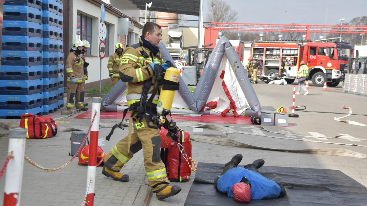 - Strażacy musieli uszczelnić zbiornik, z którego wyciekała substancja żrąca, skupili się na podniesieniu go i ewakuowaniu przygniecionej osoby z terenu zagrożenia. Na placu przed halą strażacy rozłożyli namiot odgrywający rolę komory dekontaminacyjnej – opisywał kpt. Łukasz Hajduk.