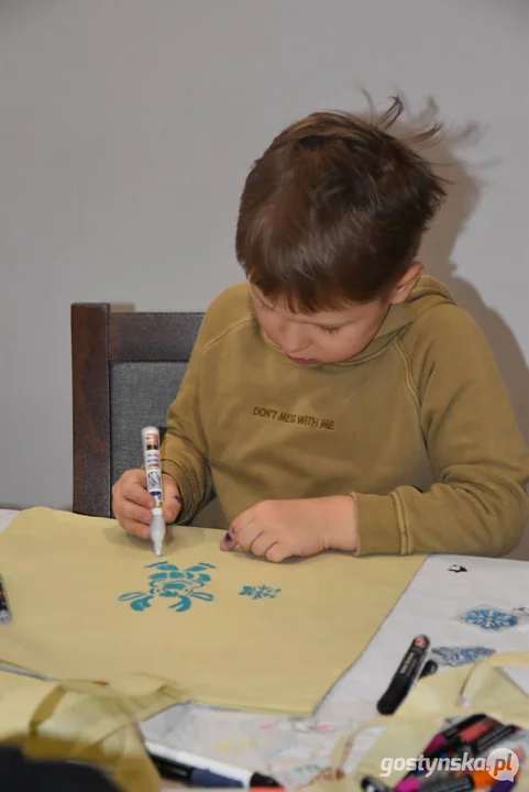 Każdy z uczestników - pomocników Mikołaja - był gotowy stworzyć torbę na zakupy z barwnym wzorem lub obrazkiem z motywem świątecznym, a także kolorowe bombki na choinkę. Zajęcia prowadziła Wioleta Radoła, z pracowni Zielone Poddasze w Kunowie. Po wysłuchaniu jej instrukcji, wystarczyło wziąć do ręki pisak, gotowy szblon - lub uruchomić własną wyobraźnię. Nie upłynęło dużo czasu, kiedy na stołach pojawiły się pierwsze dzieła.