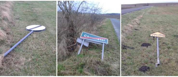 Bardzo mocno przechylone, praktycznie leżące na ziemi są dwa znaki stojące przy drodze powiatowej: ostrzegawczy A4 „niebezpieczne zakręty” oraz E18a „koniec miejscowości”.
