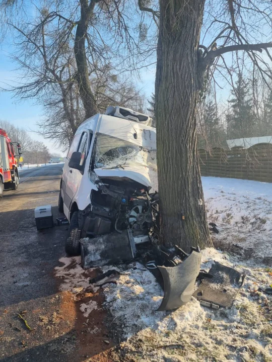 Wbicie się centralnie w drzewo przyczyniło się do obrażeń 24-letniego mężczyzny. Wskazywał na ból klatki piersiowej, uskarżał się też na ból prawego kolana.
