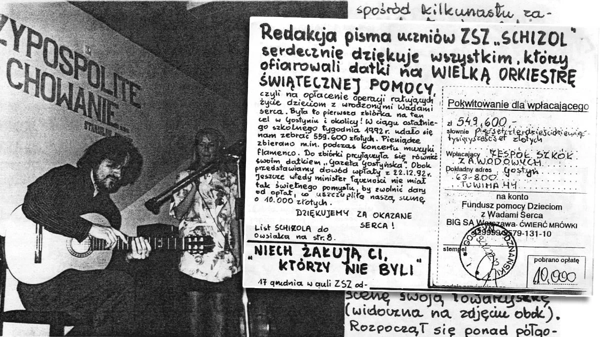 - Pieniądze wykorzystywaliśmy na kupowanie papieru do wydruku kolejnych numerów "Schizola". Ale kiedy pojawił się pomysł Owsiaka ze zbiórką na zakup karetki, to stwierdziliśmy - nie pamiętam, kto rzucił hasło, żeby pieniądze z koncertu flamenco Witka podarować Fundacji Wielkiej Orkiestry Świątecznej Pomocy. Co więcej, jak opowiedzieliśmy Witkowi, że cały dochód przeznaczamy na niesławną jeszcze wtedy fundację, to gitarzysta garść otrzymanej za koncert gaży, po wynagrodzeniu tancerki, wrzucił do puchy. Całą kwotę ze szkoły przesłaliśmy do fundacji. Tak, trochę nieoficjalnie i spontanicznie, bo nikt nie przewidywał, że fundacja Owsiaka się rozrośnie, zainaugurowaliśmy finały w Gostyniu. Zresztą sam Jurek mówił, jak się potem z nim spotykałem, że planował, że to będzie jednorazowa zbiórka, ale pozytywny odzew akcji sprawił, że Owsiak pociągnął to dalej - opowiada Mirosław Sobkowiak.