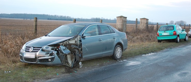 - Przeskoczyła na koleinach tylko raz, odwróciła się raz, potem drugi i poszła na mój pas. Chciałem odbić, aby się nie zderzyć, skręciłem koło, ale nie było szans - opowiada kierowca volkswagena. Auta najechały na siebie i zderzyły się bokami. - Może to i dobrze, bo do rowu byśmy wpadli - dodaje. Mieszkaniec Łęki Wielkiej jechał z 3-letnim synkiem. Podróżującym volkswagenem nic się nie stało.