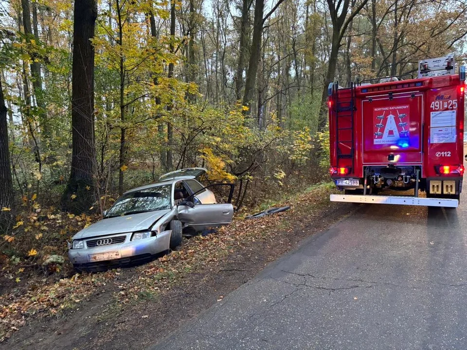 Służby ratunkowe otrzymały informacje o wypadku, do którego doszło przy ulicy Leśnej w Kobiernie. Na miejsce skierowano dwa zastępy z Jednostki Ratowniczo - Gaśniczej Państwowej Straży Pożarnej w Krotoszynie, jeden zastęp OSP Kobierno, policję i zespół ratownictwa medycznego.