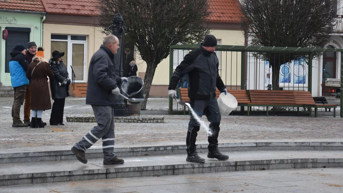 Z wiadrami pełnymi soli na rynek przybiegli również pracownicy ZGKiM w Gostyniu, by kilka minut przed wejściem na plac uczestników patriotycznej manifestacji, w pośpiechu posypać kostkę, schody czy granitowe płyty, którymi wyłożony jest plac w sercu miasta. Trochę zaspali lub zapomnieli, że do ich obowiązków należy zimowe utrzymanie miejsc publicznie dostępnych, których właścicielem czy zarządcą jest gmina.