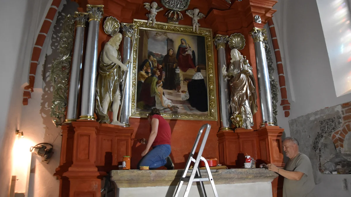 - To jest oryginał ołtarzyka. Drewniane elementy nie pasowały, wręcz przeszkadzały, więc przy wcześniejszych dużych remontach wyniesiono je na strych. Teraz kolega to znalazł. Zaimpregnowaliśmy drewno, gdyż było już zniszczone. Widnieje na nim łaciński opis dotyczący dekretu i kanonu kościelnego, a wszystko to wyjaśnia, co łączy świątynię w Starym Gostyniu z zakonem benedyktynów w Lubiniu - opowiadał podczas prac konserwator zabytków.