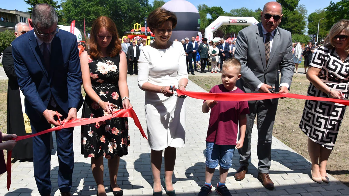 Po pierwszej części uroczystości, zakończonej występami przejętych przedszkolaków, goście przeszli pod drzwi wejściowe do dobudowanej części przedszkola. Tam rozciagnięta była wstęga, którą symbolicznie, na znak otwarcia przedszkola, przecięli minister Marlena Maląg, dyrektor Renata Matelska oraz burmistrz Marek Rożek. Towarzyszyli im przedstawiciele przedszkolaków i rodziców.