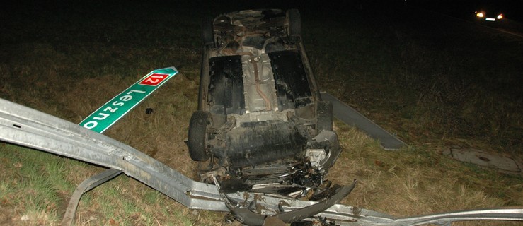 Uszkodzone przydrożne metalowe bariery, zniszczone znaki i drogowskazy oraz dachujący samochód osobowy w polu - to rezultat nieostrożnej jazdy mieszkańca powiatu jarocińskiego.